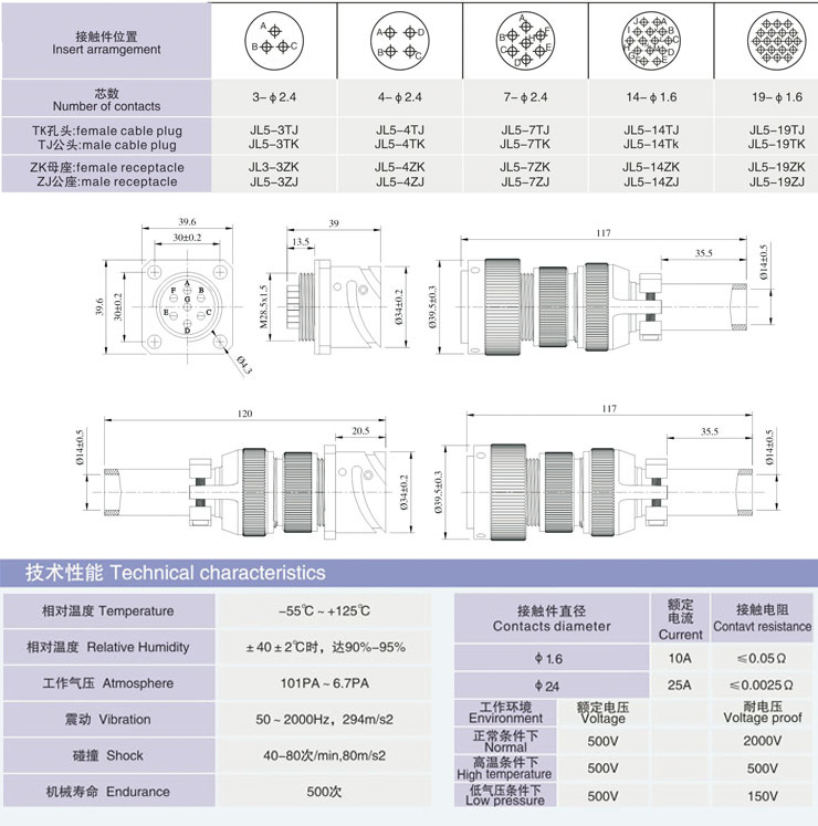 JL5 serles clrcular connectors are made according to ministry of railway standard TB/T2716-1996.the connector’s socket is covered with guided stainless sleeve and allows the connector to have the advantages of low contact reslstance,long endurance,etc.the connection type between the plug and the receptacle is bayonet coupling with quick mating and easy use.this connector is wldely used for the connection of electrical equipment of rail train.the plug or the receptacle may be mounted with both pins and sockets.