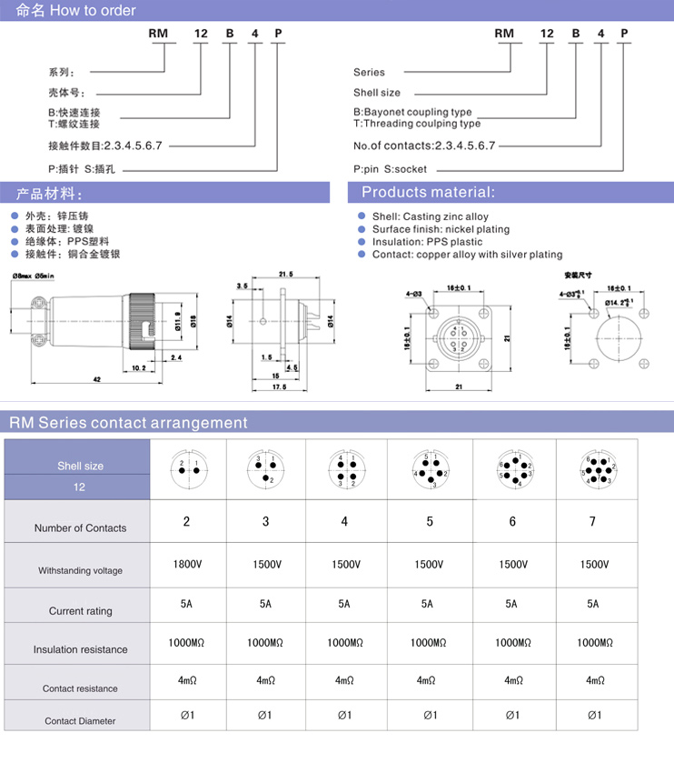 RM series connector is specially designed for communication equipment and electronic equipment,there are 6 kinds of contacts,2,3,4,5,6 and 7 pins,the lock mechanisms with bayonet coupling and thread coupling,quick detachable connection and convenient installation and use,RM series connectors have Small size,rugged and excellent in mechanical and electrical performance thus making it possible to meet the most stringent demands of users.
