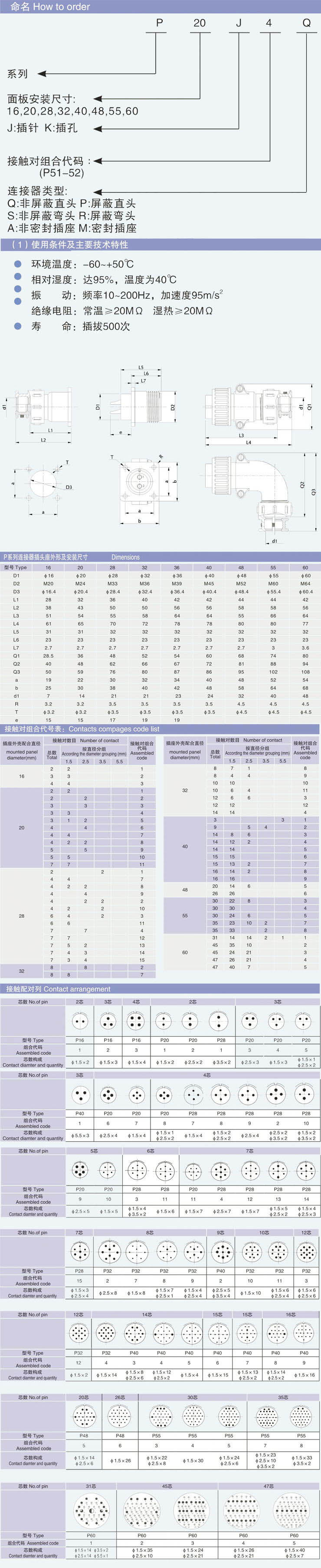 P series circular connector,accords with SJ/T1049694,1800 pieces of specificatlon,include:straight,angle,screen,non-screen,seal,and non一seal,etc.the diameter of contacts are φ1.5, φ2.5, φ3.5, φ5.5mm,golol and silver-plated.