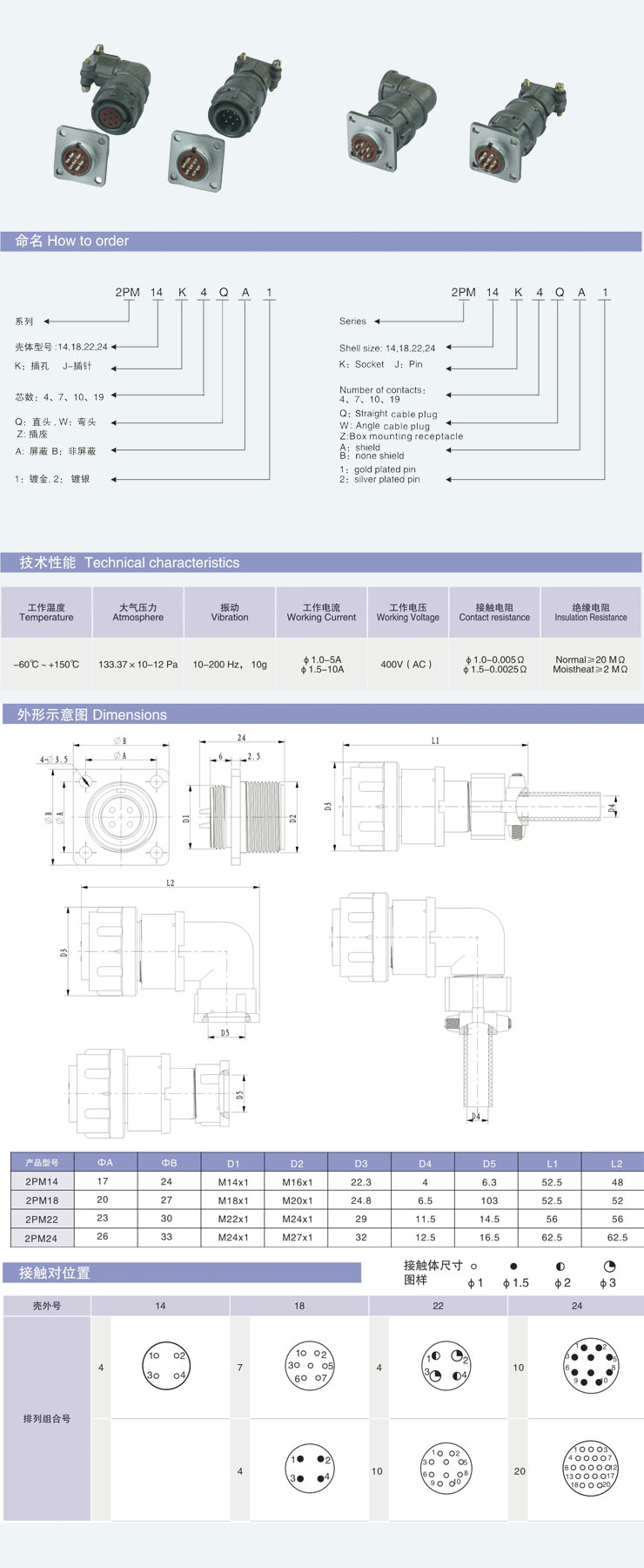 2PM系列連接器,主要是采用了俄羅斯連接器的技術,其廣泛用于設備之間的電連接和信號傳輸,其獨有的外形及結構設計能彌補很多其他類似連接器在用途上的缺陷,例如外殼穿線孔及尾部螺絲的獨特設計,使起運用當中更加便利科學。內部絕緣體及插針插孔的結構設計也增強了其獨有的穩(wěn)定及可靠性,此系列連接器同時也具體一定的防水性能,可以防止室外雨淋等現(xiàn)象,其特殊的結構和使用r性能已經贏得了市場的普遍認可。
