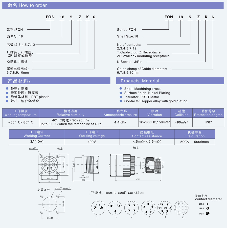 FQN18 series waterproof connector modifed based on FQ series products.these seres connector has the advantages of small volume,inner bayonet fast connection,environment resistant,waterproof,anti salt,anti mildew,simple operation.Spectra of FQ and Q series of products with the installation dimensions and contact type products.terminations are wire welding type,the products are widely used in various electronic instruments,electronic,electrical equipment,waterproof requirements of the electric connection.Products meet the standard of the Ministry of Railways TB/T2761.